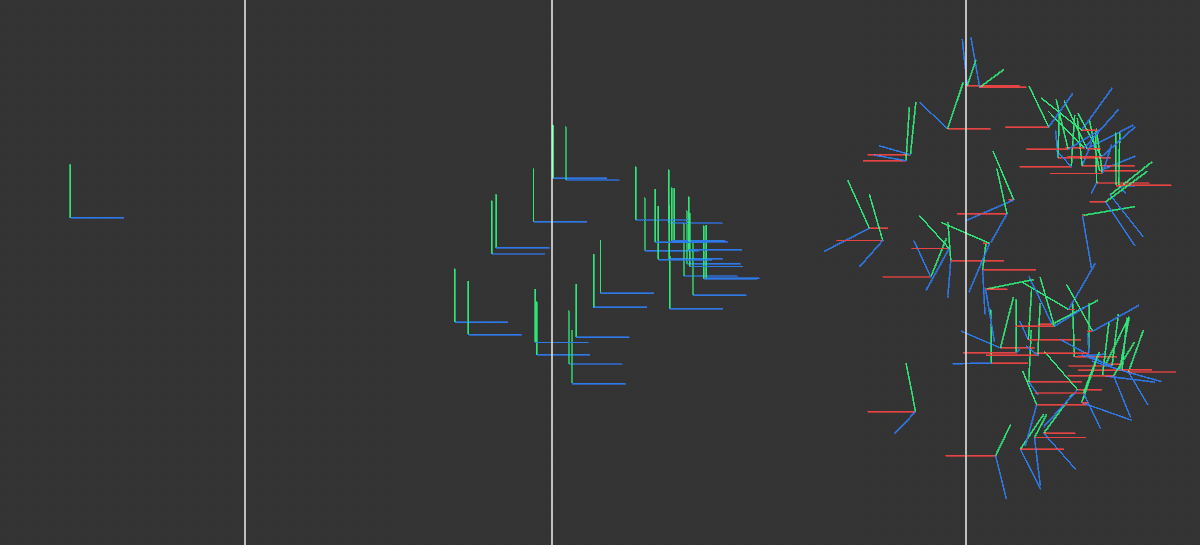 Wird hingegen Ausrichtung erben auf 0% belassen und stattdessen die Geschwindigkeitsrichtung als Vorwärtsvektor genutzt, erhalten wir das Ergebnis ganz rechts in der folgenden Abbildung. Die Z-Achsen der neuen Partikel weisen nun korrekt in Richtung der jeweiligen Flugrichtung.