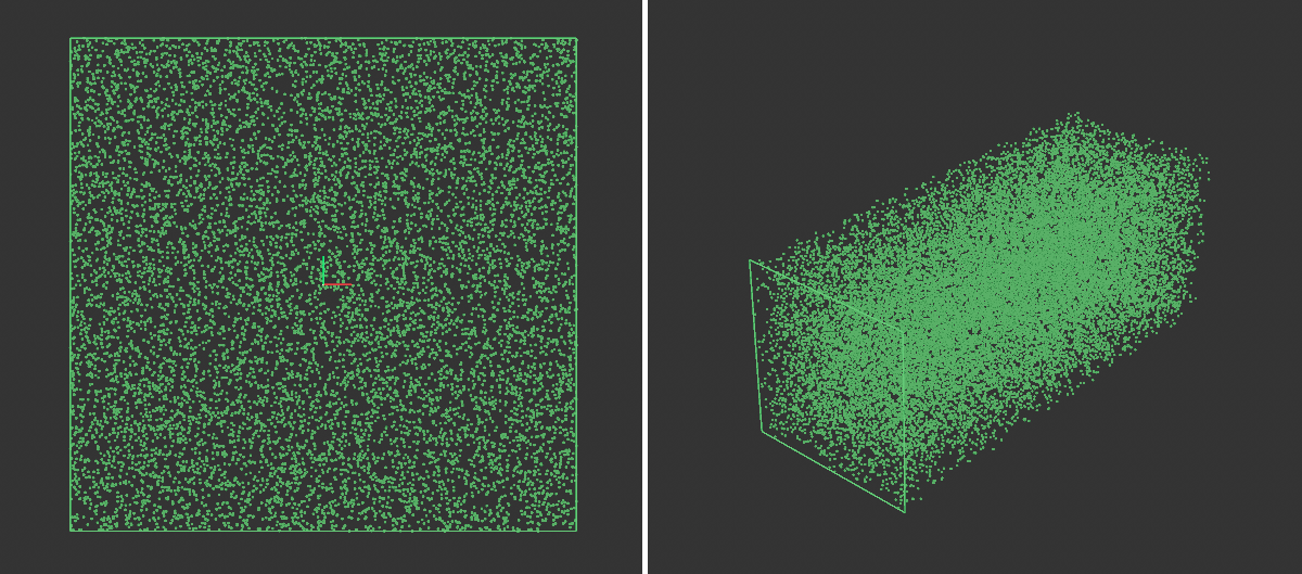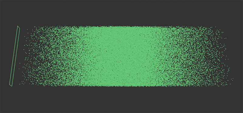 Hier ist eine gleichmäßige Verteilung von Partikeln am Beispiel einer rechteckigen Emitterfläche zu sehen. Die Partikel erscheinen völlig zufällig am Emitter.