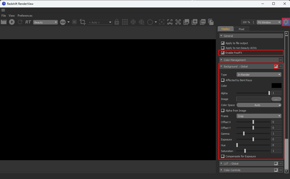 The global settings for the Background can be found as a PostFX in the RS RenderView. Click on its cog icon in the top right corner, ensure that Enable PostFX is activated, and then tick the box for the Background: Global category to access the global Background settings for this scene.