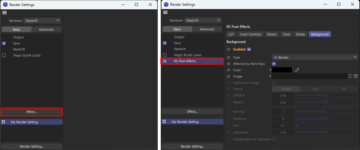 Another option to access the global Background settings is from the Post Effects category in the Render Settings, as can be seen in the next image. If that category is missing there, just add it manually by clicking on the Effect... button (see left side in the following image).