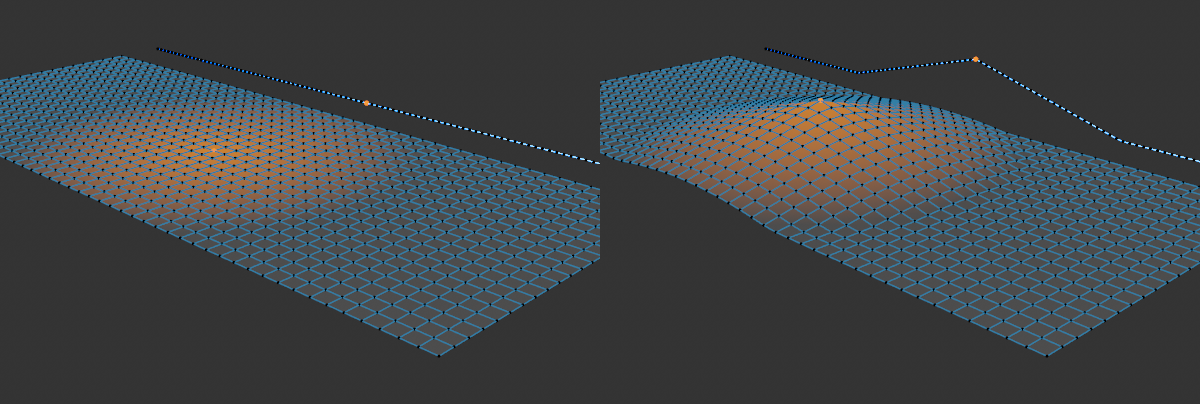 Mit weicher Selektion selektierter Punkt auf polygonalem Objekt und Spline werden nach oben verschoben.