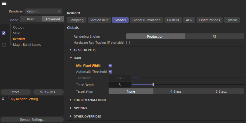 Before we render let's take a look at at the Optimization tab in Redshift's Render Settings. We are going to enable Hair Min Pixel Width which will allow for cleaner results without having to crank up our unified sampling. More information on the Hair Min Pixel Width can be found here.