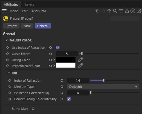 When Use Index of Refraction is disabled, this option controls the shape of the Fresnel fall-off curve as it transitions between the Facing Color and the Perpendicular Color.