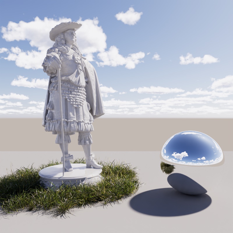 The example scene in this section features a Cornell Box with a bust from Three D Scans that is separated into pieces with different materials to illustrate the impact a light has on each shading component. The components and materials used in the scene are: