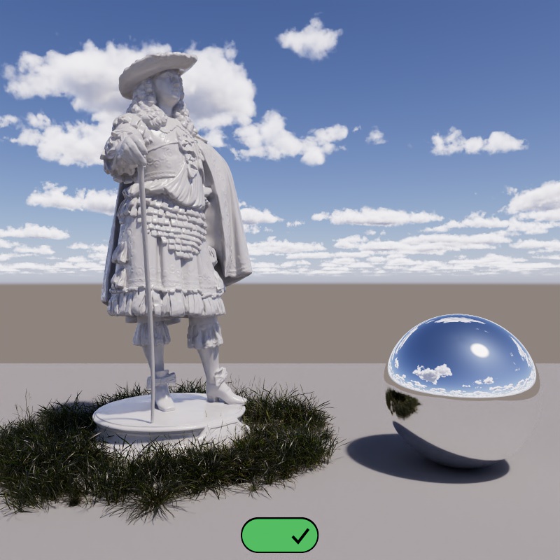 In the examples below the first two images have Non Physical Intensity disabled. The first image represents a brand new scene with no camera exposure adjustments, resulting in a blown out scene, in the second image the camera's Exposure parameter has been reduced by 4 stops (exposure of -4) to compensate, resulting in an appropriately sunny look. In the last image, the camera uses the same default settings as the first image but Non-Physical Intensity is enabled — this brings the sun intensity into a range that is visually appealing without the need for further adjustment.