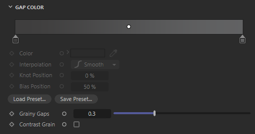 Controls the type of color blending mode used between the gap color and gap graininess. When enabled, a softlight blend mode is used. When disabled, an overlay blend mode is used.