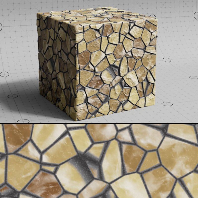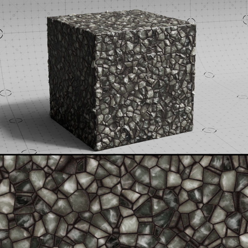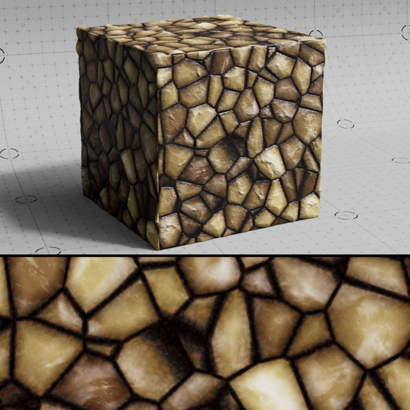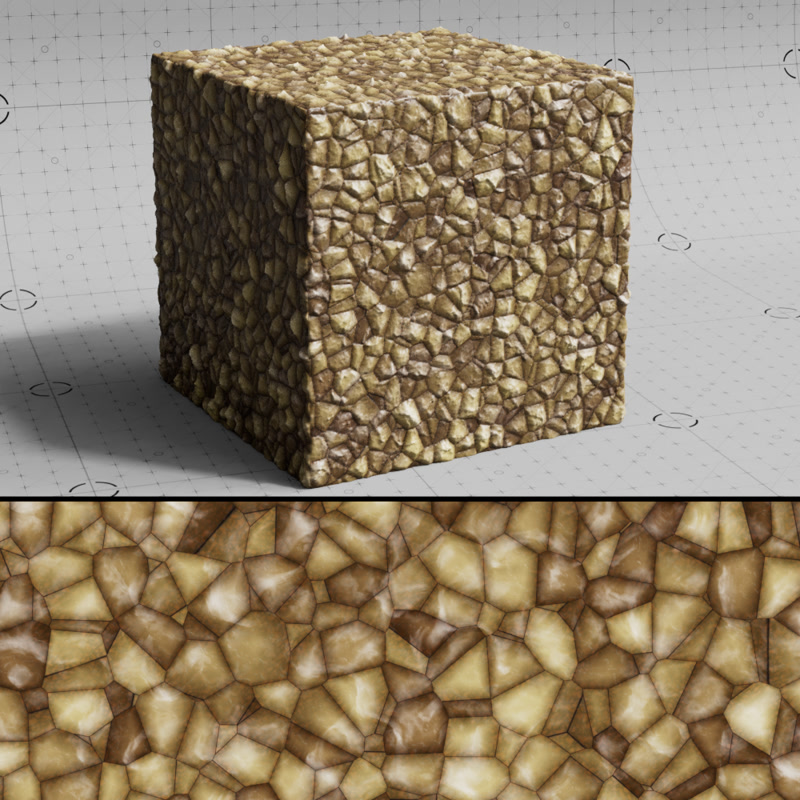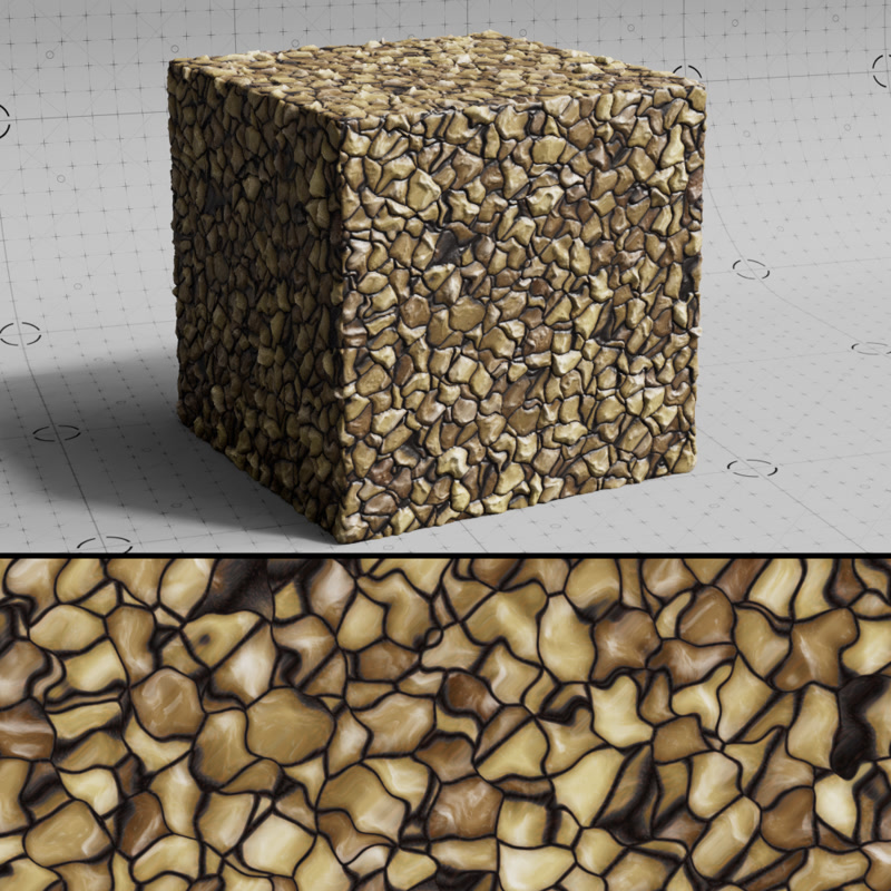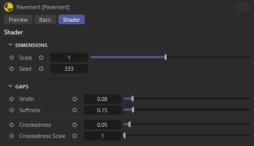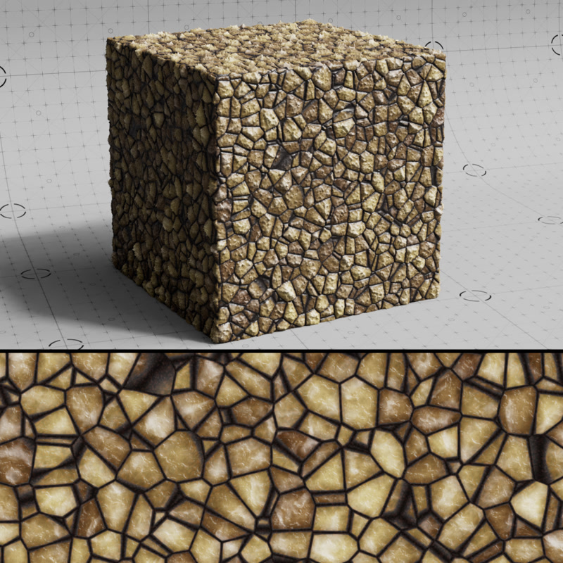 The pavement shader is a procedurally driven texture that can be used to generate fine detail for surfaces like cracked pavement, flagstone mosaic patterns and more. By default it is set up to create a desert-like cracked and stoney surface. Artists can randomize the color of each stone with a gradient, and adjust the size, color and crookedness of gaps.