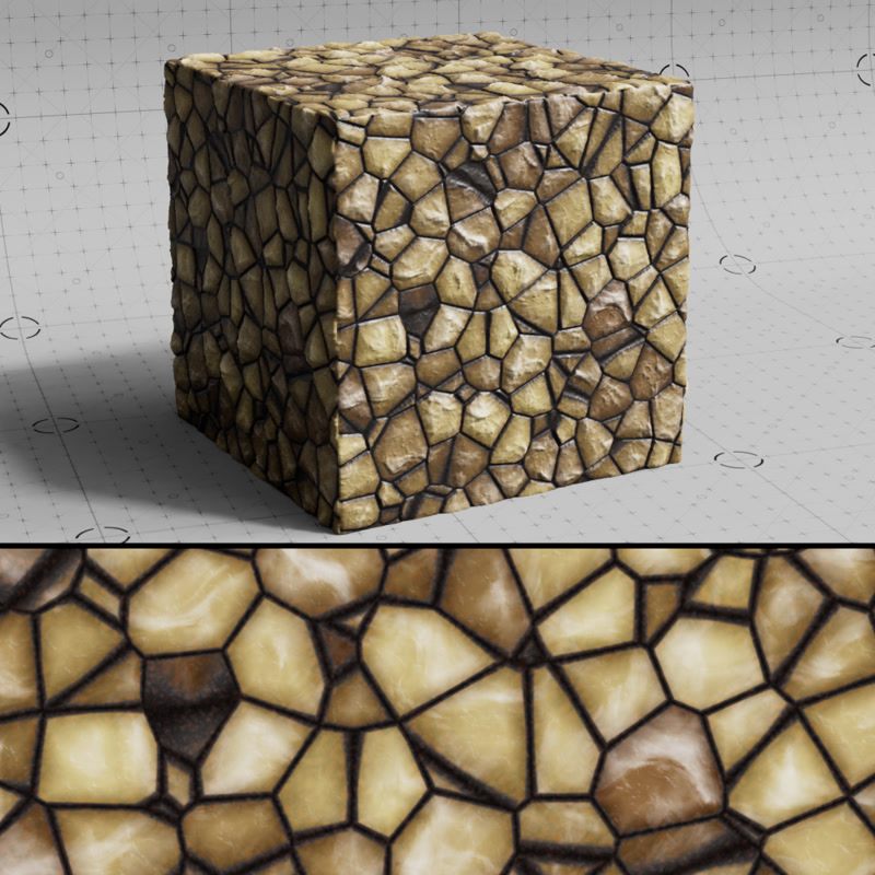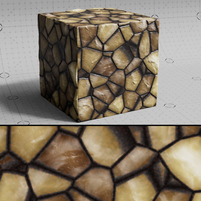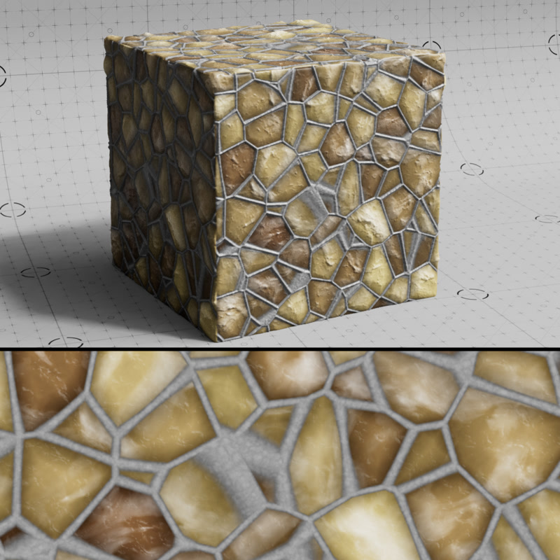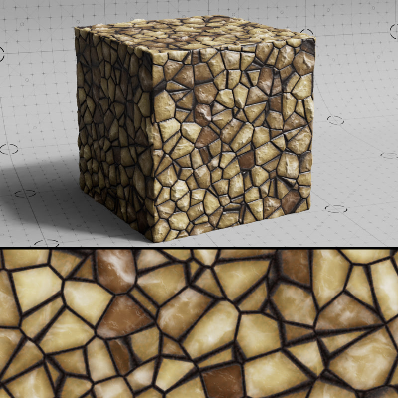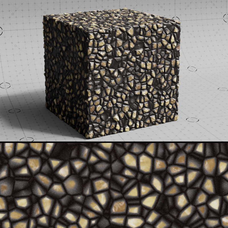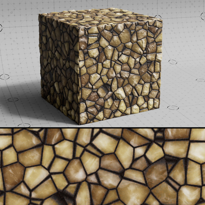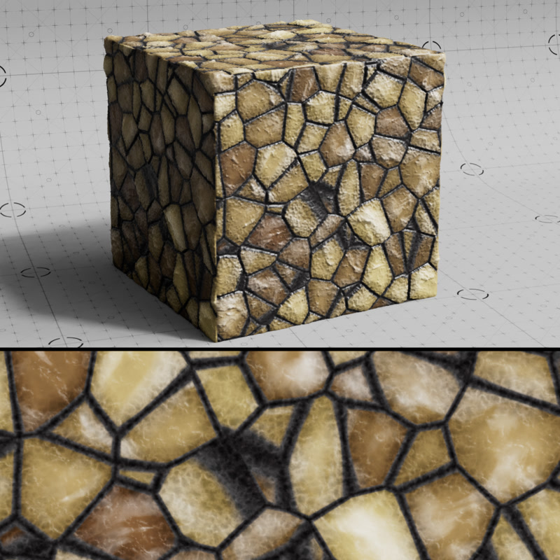 The pavement shader is a procedurally driven texture that can be used to generate fine detail for surfaces like cracked pavement, flagstone mosaic patterns and more. By default it is set up to create a desert-like cracked and stoney surface. Artists can randomize the color of each stone with a gradient, and adjust the size, color and crookedness of gaps.