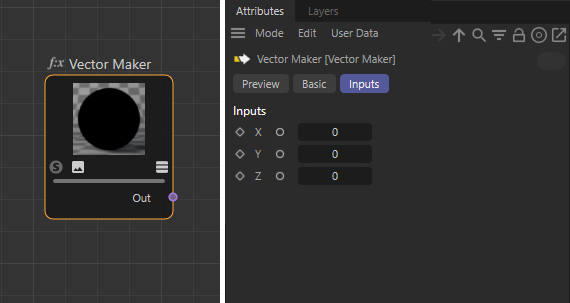 Input separate X, Y and Z values to create an output vector. This can be used to create a position vector, a direction vector or a color vector.