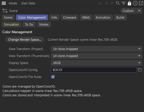 If you would like to use your own custom OCIO config instead it's as simple as changing the OCIO configuration path in the Redshift Color Management settings to your own config file.