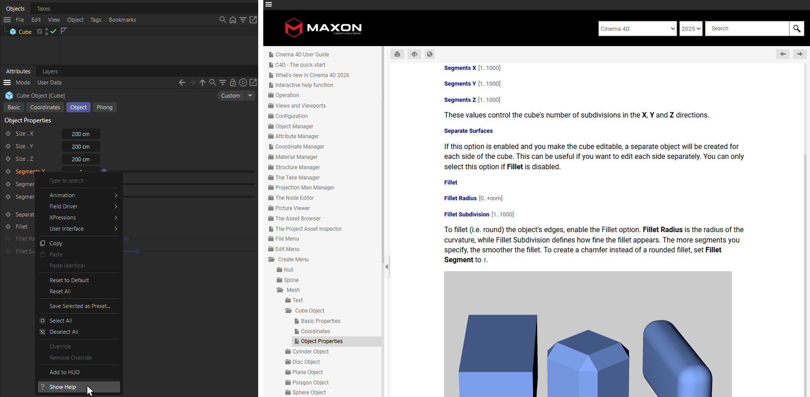 The interactive help is deeply integrated into the Cinema 4D interface. In many cases, you can right-click on a parameter, such as the Segments X setting of a cube in the example above, to call up the Help from the context menu, which then directly displays the explanations for this parameter (on the right in the image).