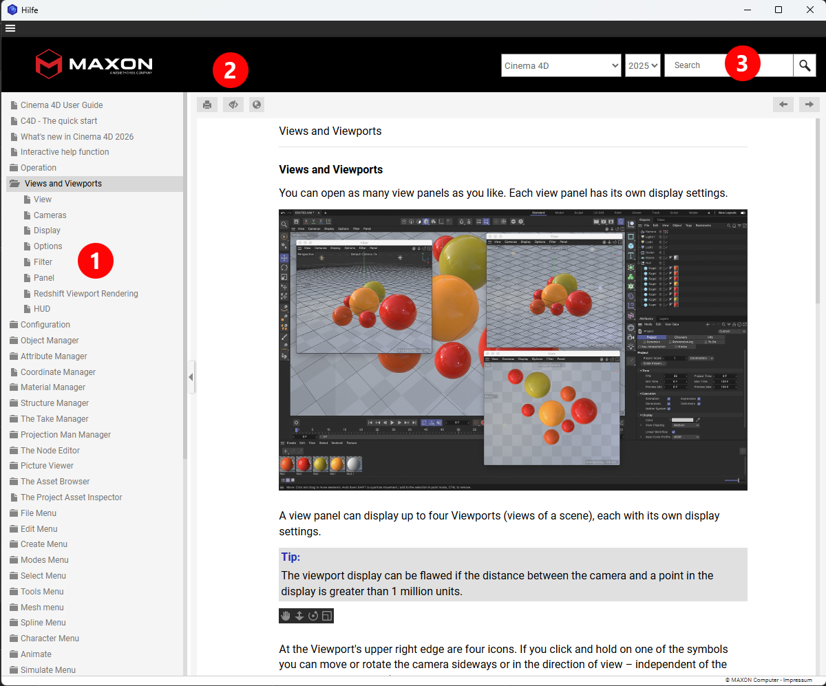 - Language Selection: Switch between the different language versions offered here. For example, Spanish or Italian help can also be displayed, even if it was called up from a German or English Cinema 4D version. Please note, however, that the English and German language versions are always slightly more up-to-date than the other languages.