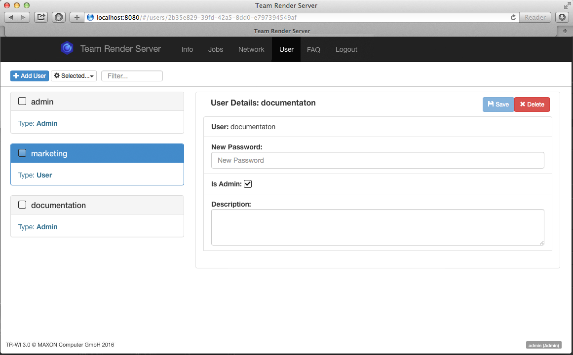 After the user has been added, they will be able to log in to the Team Render Server using the information provided (browser address: see Browser Interface) and manage render jobs.