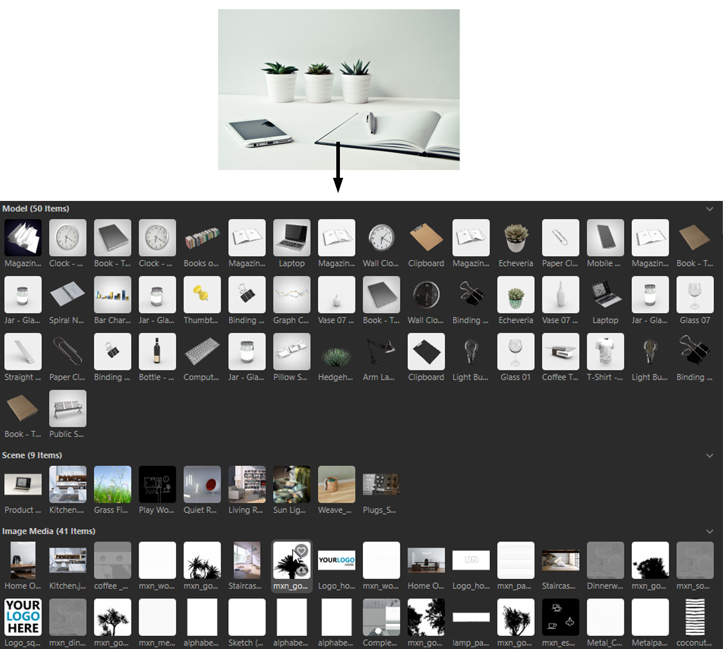 Potted plants, open books, electronic devices and an office environment were recognized. Consequently, corresponding objects from the Asset Browser - especially models and scenes - are listed as hits.