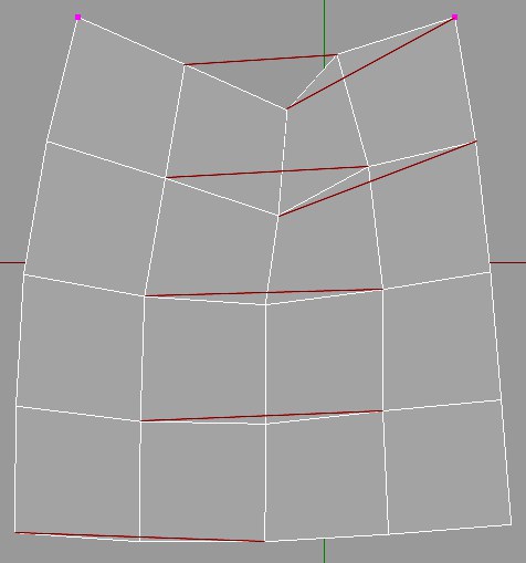 As the name suggests, these springs make it possible for the cage to flex. Springs are created that connect an individual point of a given polygon with a point of another polygon, as long as these polygons are not adjoining. To put it differently: the spring omits one point between start and end points. The percentage value defines the strength with which the Cloth object will flex around the given points.
