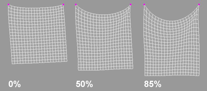 This parameter controls the amount of stretching that the cloth object will be able to do. The default value of 0% will not allow for the cloth to stretch; whereas, a value of 100% will allow the cloth to be stretched. This parameter can also be controlled through a vertex map by using the respective field on the Effects tab.
