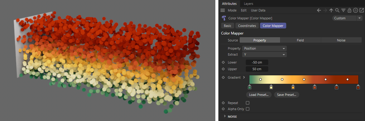 After activating the option, the color gradient may also be repeated if particle properties provide greater values than those defined for Upper. The following image shows an example. There, the Y-positions of the particles were output, which lie between -50 cm and + 50 cm. By using Lower -25 cm and Upper +25, the process will be repeated for the particles above 25 cm. The Repeat option will not change anything for particles that are below the Lower.
