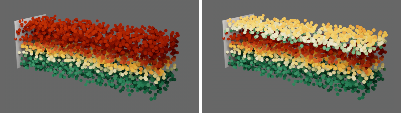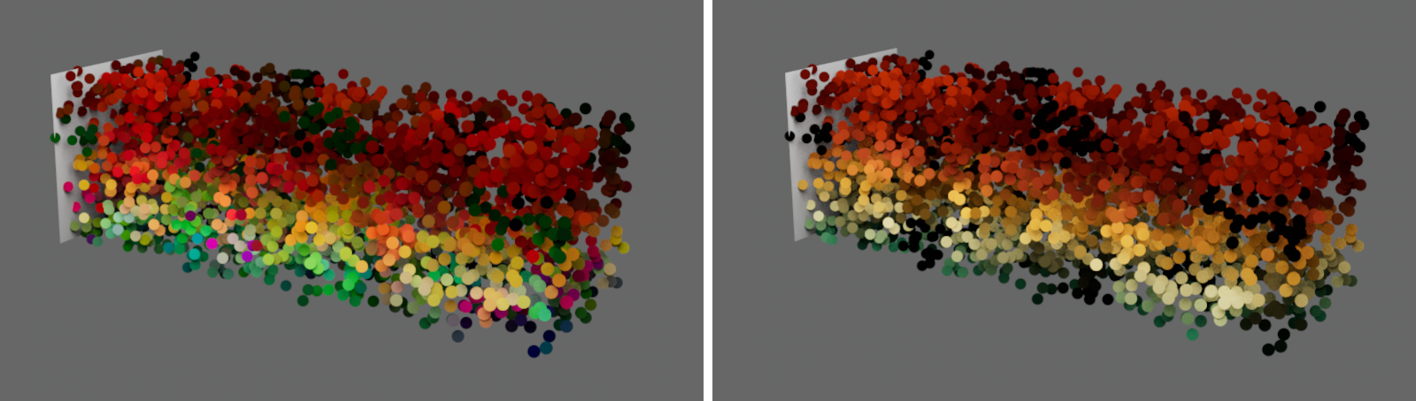 Here, a color gradient is applied to the particles along the Y-axis using the Source property. The Noise option is also activated. On the left, the Uniform per Channel option is disabled, on the right it is enabled.