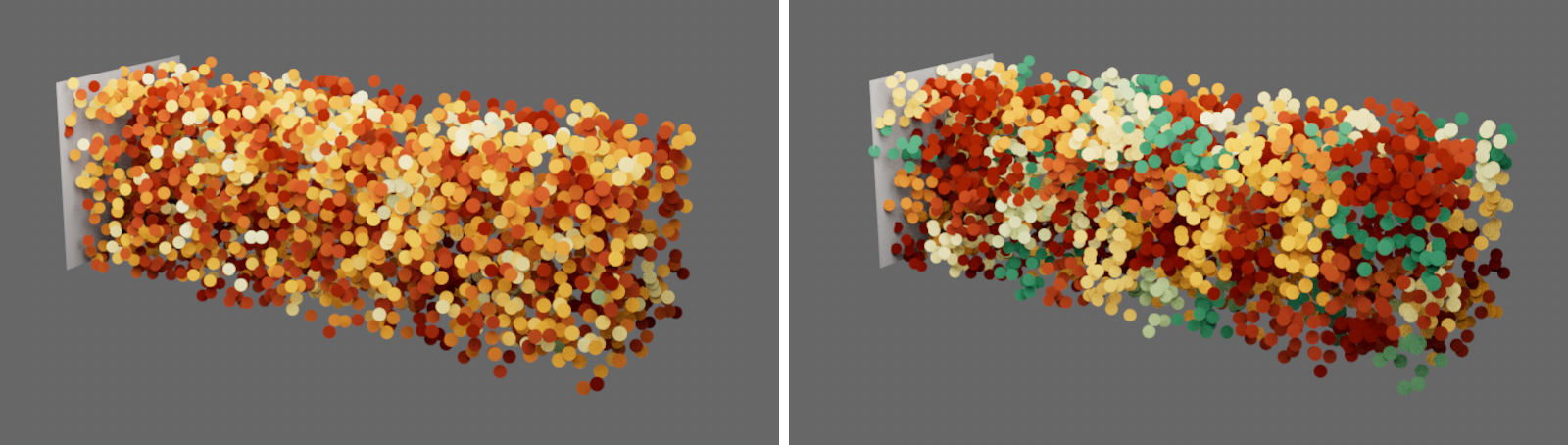 Here, a color gradient between the Y positions -25 cm and +25 cm will be applied to the particles. Left without, right with repetition, whereby the particle flow lies between -50 cm and + 50 cm on the Y-axis.