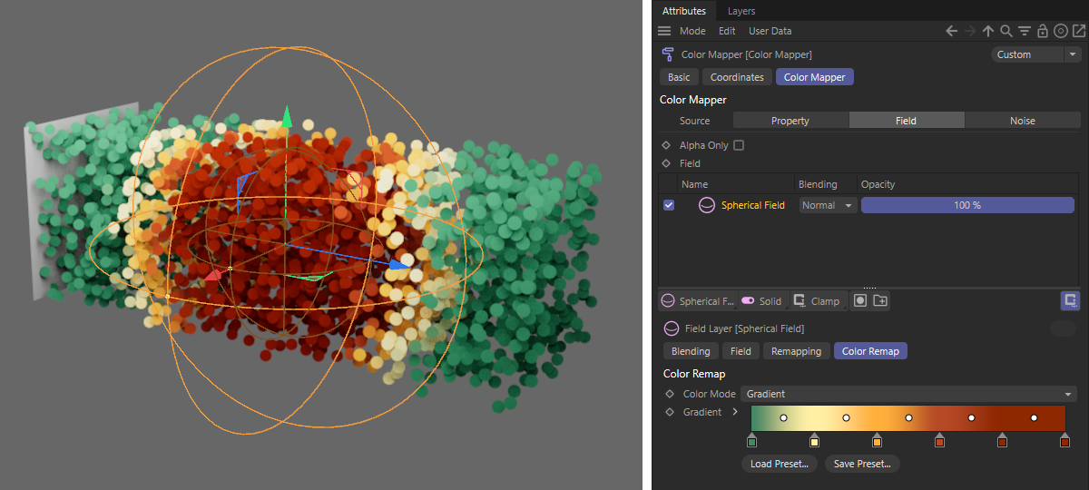 Here, a Sphere Field was given a color gradient and placed in the particle stream.