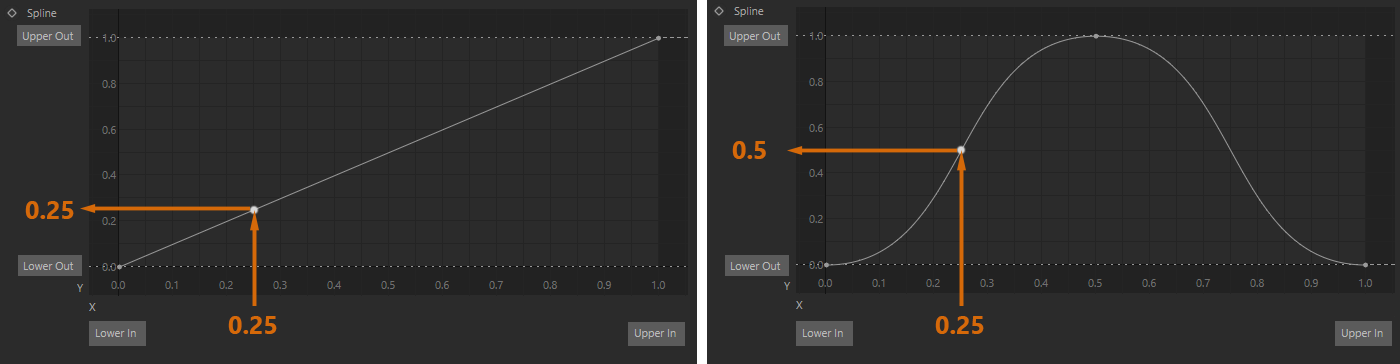 However, this only applies to a linear Spline that runs from the bottom left-hand corner to the top right-hand corner. This simple rule of three conversion can be changed by deviating curves. You can imagine the 25% calculated in our example as a value on the horizontal axis of the Spline. The lower edge of the graph represents the Lower Out value, the upper edge represents the Upper Out value. The result now corresponds to the height of the curve above the point marked above our percentage value. The following image illustrates these relationships.