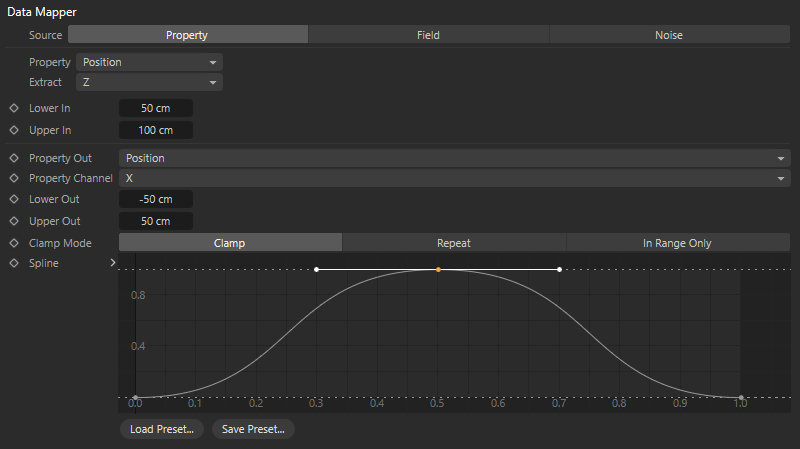 This setting is only available for Source Property, as only here can you work with an individually adjustable range for the input values. For the Source modes Field and Noise, the input values are automatically limited between 0 and 1.
