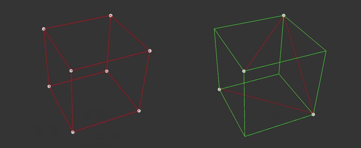 The following illustration shows how this distance is applied depending on the selected Pattern. For the Grid Pattern, Distance corresponds to the distance between the particles in both the horizontal and vertical directions (indicated by the red edges on the left in the figure). For the Sphere Packing Pattern, however, the Distance is applied diagonally, i.e. between the particles of different depths and heights in the grid (shown on the right in the figure by the red lines).