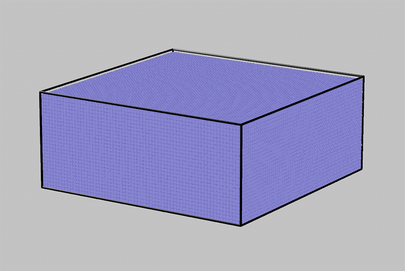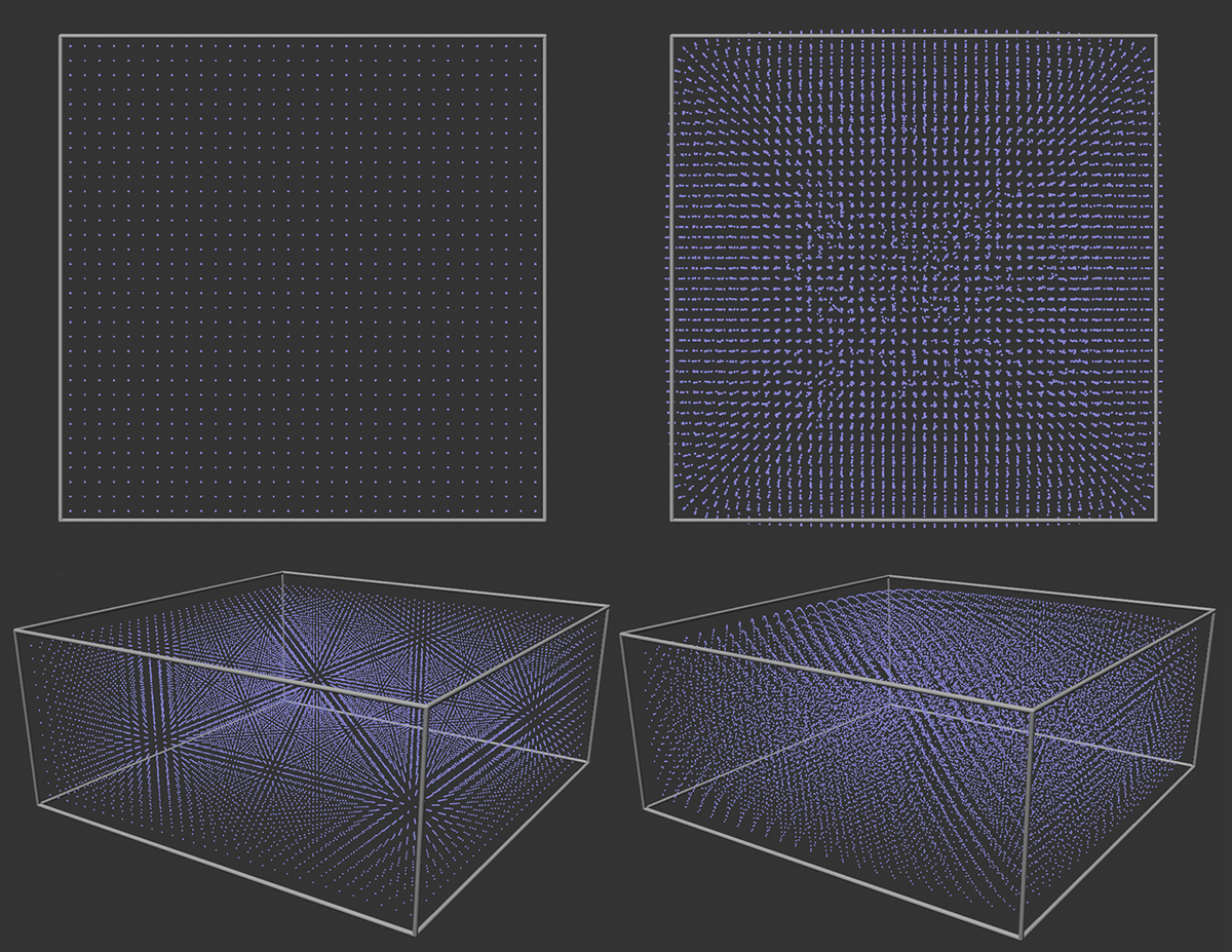 - Grid: The liquid particles are arranged three-dimensionally in regular rows and columns. The distances between the particles can be specified either depending on the Default Radius setting of the Simulation Scene or the Scene Settings or also individually via the subsequent Distance value in the Emission settings of the emitter.