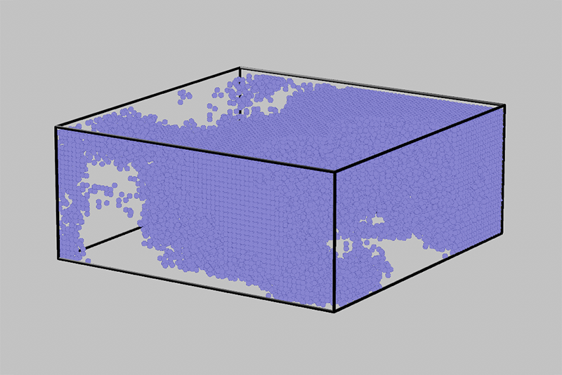 Here, a simple box is filled with liquid particles. The Grid option was used on the left and the Sphere Packing option on the right.