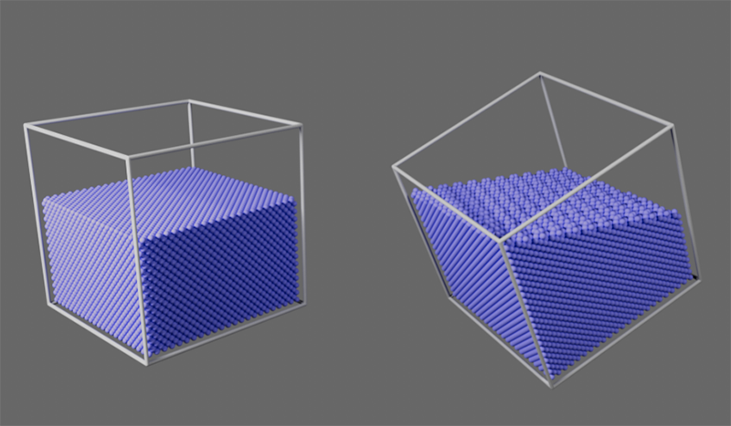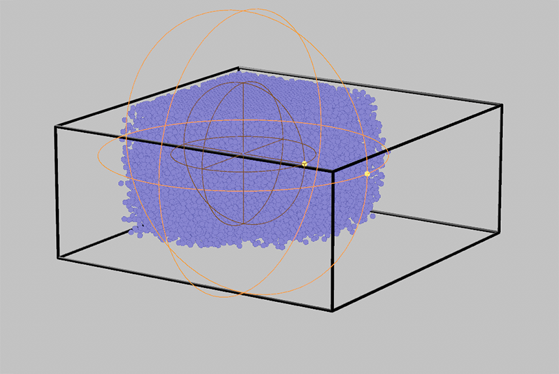 Here, a cube was assigned as the Geometry and 60% of it was filled with particles along the positive Y-axis. Since the Global axis system was specified as the reference, the liquid level remains parallel to the horizon of the scene even after the cube has been rotated.