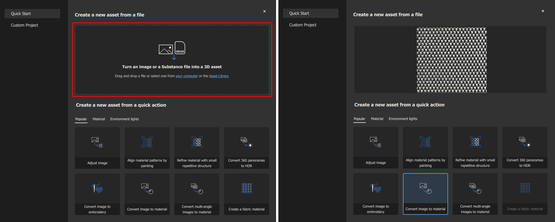 Below this area there are various buttons from which you can select the Convert image to material function. The following illustration shows these steps.