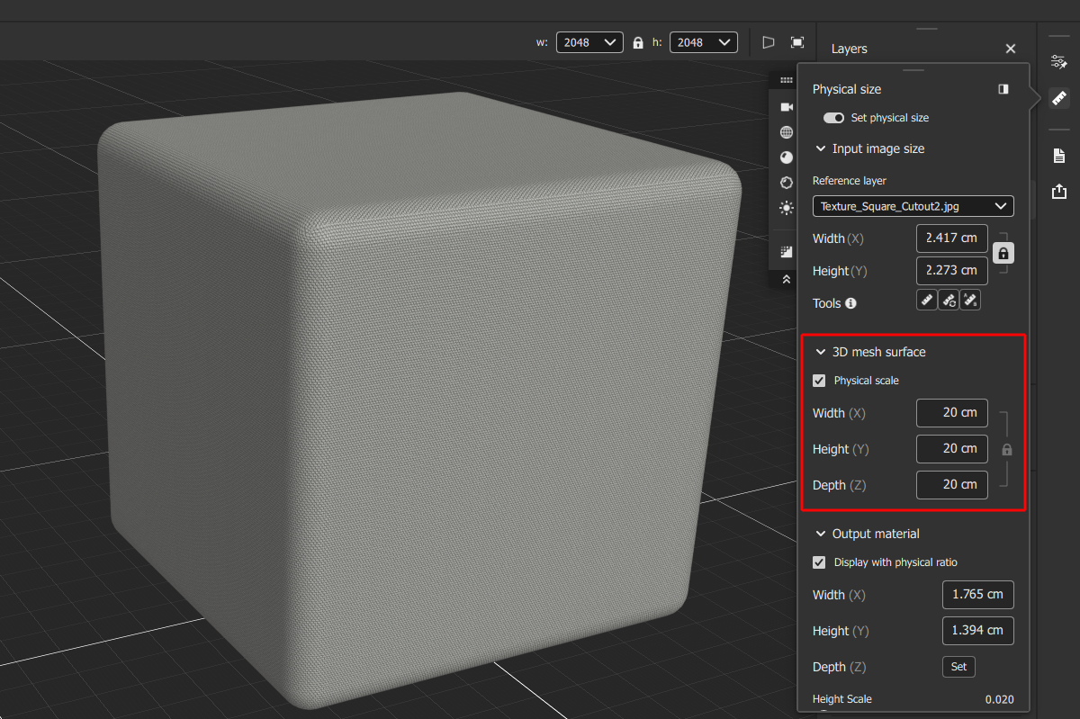 The physical size of the material can now also be checked directly visually by activating the option for Physical scale in the 3D mesh surface area of the dialog. Below this, you will find dimensions for the geometry used in the viewport. In our example, we use a rounded cube with a side length of 20 cm, comparable to the maximum dimensions of the small hard case. Accordingly, the scaling of our material representation on the cube is now adjusted so that it looks like the real hard case (see figure above).
