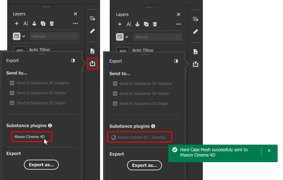 To do this, we first make sure that Cinema 4D is running and then open the Substance 3D Sampler export settings by clicking on the corresponding icon on the right-hand side of the interface. In the dialog box that appears, we find the entry for Maxon Cinema 4D in the category for the Substance plugins (see left illustration in the figure above). The export process is then started by clicking on the term Maxon Cinema 4D. An animated process icon appears until all bitmaps have been saved and sent to Cinema 4D. You will then also receive a green notification at the bottom of the screen when the export is complete (shown on the right in the above illustration).