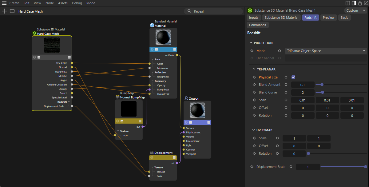 To do this, select the Substance 3D Material node in the Node Editor and navigate to its Redshift settings (see also the figure above). Alternatively, you can simply select the material in the Material Manager and then select the Redshift tab in the Attribute Manager.