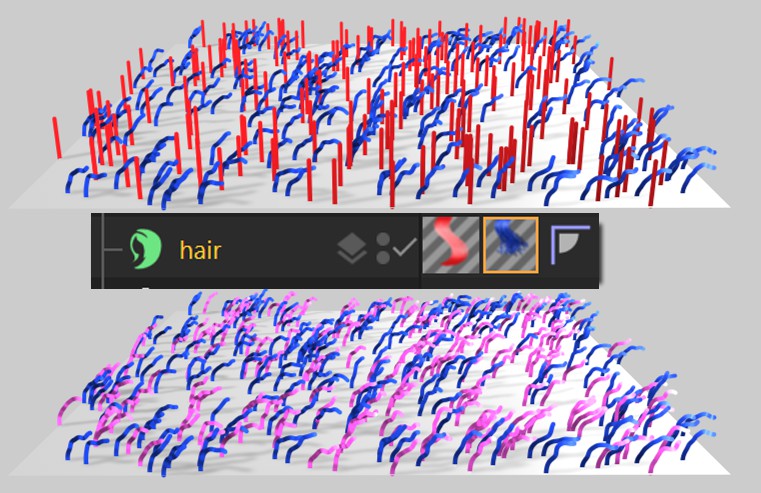 If this setting has been deactivated, the selected tag will (depending on its settings) more or less affect all hair with its Hair material. This is evident in the foregone example, in which the pink hair (lower half of the image) is affected equally by both Tags.