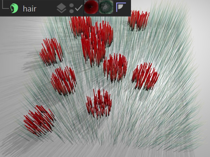 Radius defines the maximum allowable clump radius, and Limit defines the maximum number of hairs allowed per clump. These three settings do not work independently of on another, i.e., the desired result will not be achieved if one of these settings conflicts with any of the other two. If you are not satisfied with the result of the randomly placed clumps, their placement can be varied using the Seed setting in the HAIR object's Advanced tab.