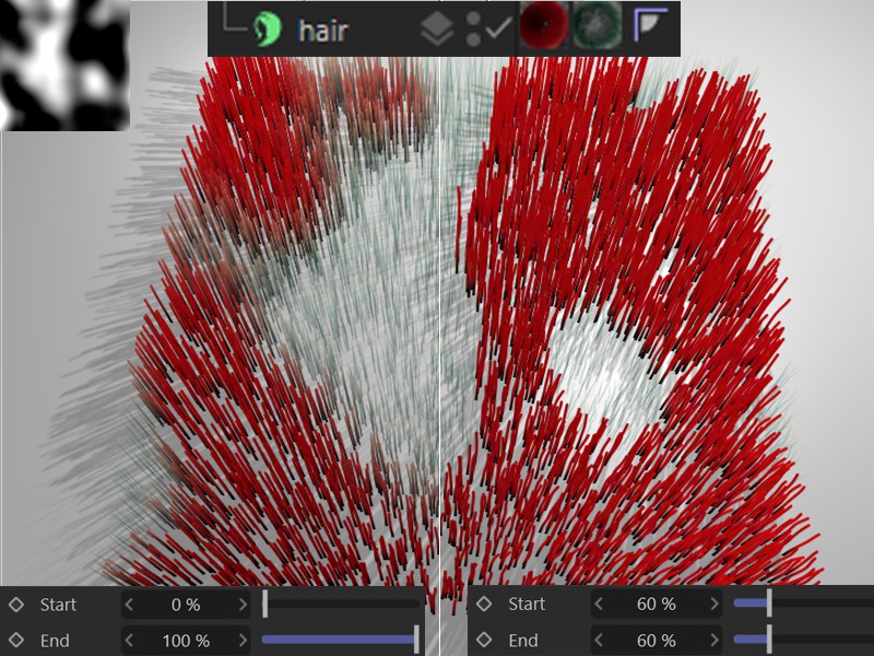With this option you can define which hairs will be selected for this tag to affect, based on the grayscale values of a texture loaded into the Texture field. Use the Start and End sliders to constrain the grayscale values, thereby constraining the number of hairs selected. You can mix this Tag's Texture setting with that of the preceding Tag's (at 0 and 100 for both settings). If you want to avoid mixing, give both Tags equal Start and End values. If no preceding tag exists (no Hair Material tag to the left of the current tag in the Object Manager), the blonde default Hair material will be mixed with your current tag.