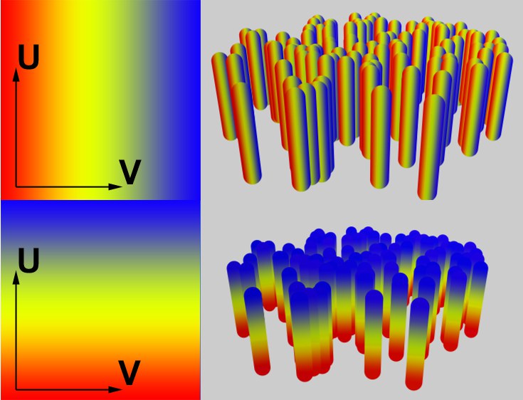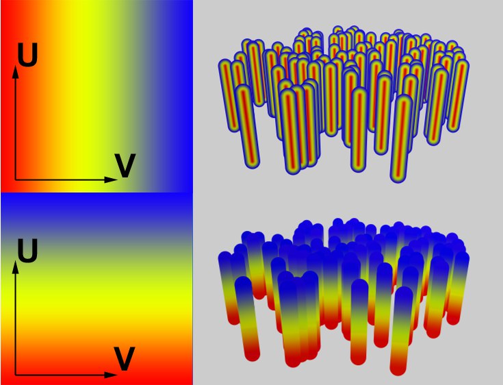In the U-direction, the texture will be applied from the hair root to the tip; in the V-direction, the texture will be applied from the left edge of the hair to the right.