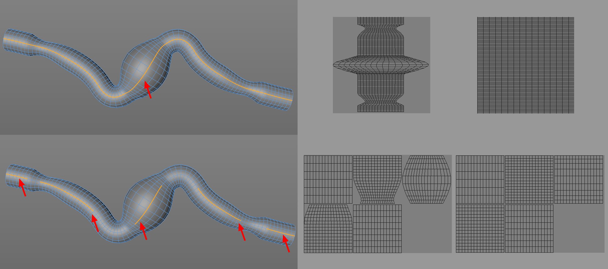 Depending on the edge selection made, clean UV wraps can be created. These can also be made completely homogenous (far right), if desired.
