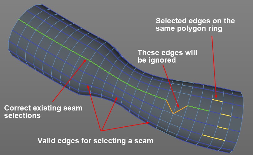 A seam must be defined (it must always run perpendicular to the edge loops, i.e., along the cylinder's length), which is used to create the UV island (the UV mesh is opened along the seam). The seam is defined using an object edge selection and should be located on the object's backside. The seam must consist of a series of connected selected edges that are each part of a closed polygon ring made up of quads. When the UV Peeler tool is active it will display the edges that can be selected: