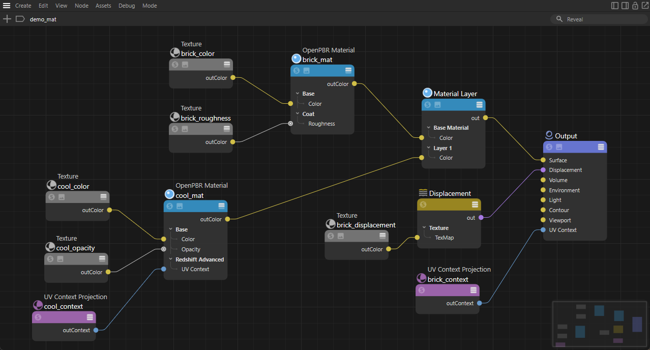 The UV Context Projection node can be used to place a texture in a scene with precision. In this example a graffiti material with the word "Cool" is placed on a brick wall material. There are two UV Context Projection nodes in use, one is used for the Brick material while the other is used for the cool material. The brick material requires displacement so it uses UV Context node in Tri-planar mode connected at the head of the shader chain, this way the brick material and the brick's displacement textures inherit the UV mapping.