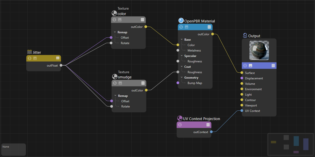 The ports of a UV Context Projection node only allow a constant input, meaning nodes like a texture and jitter cannot drive its parameters. However the UV adjustment options on individual nodes still work in combination with a UV Context connection. This allows you to connect a jitter node to the Offset and Rotate of a texture node to add randomization to your material and still control overall texture placement using the UV Context Projection node.