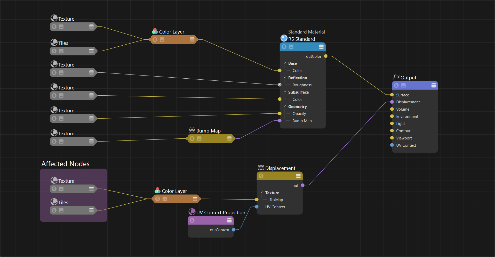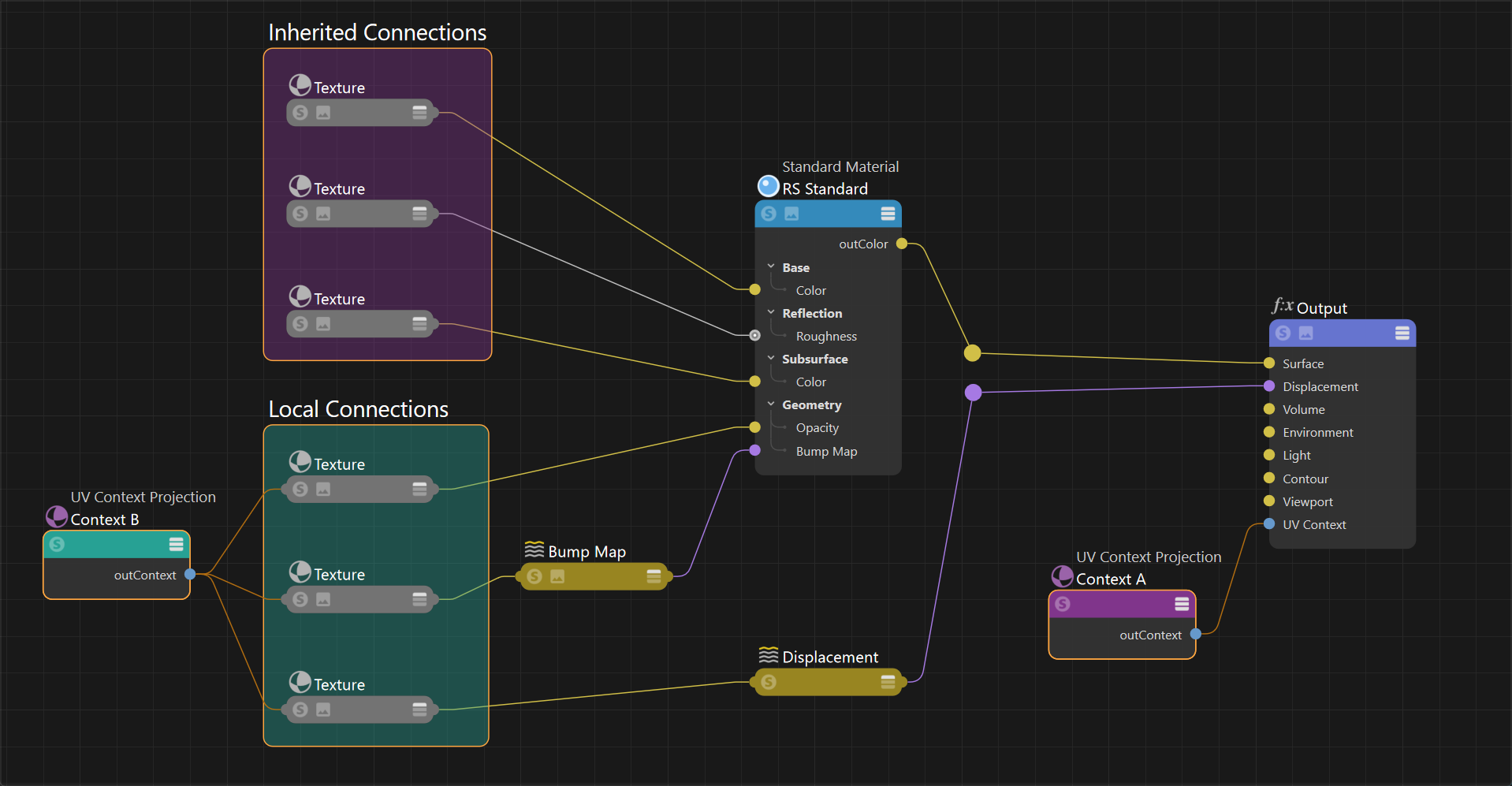 | Inherited connections UV Context Projection connected to the Material Output node All textures connected to the Material and Displacement shaders are upstream |