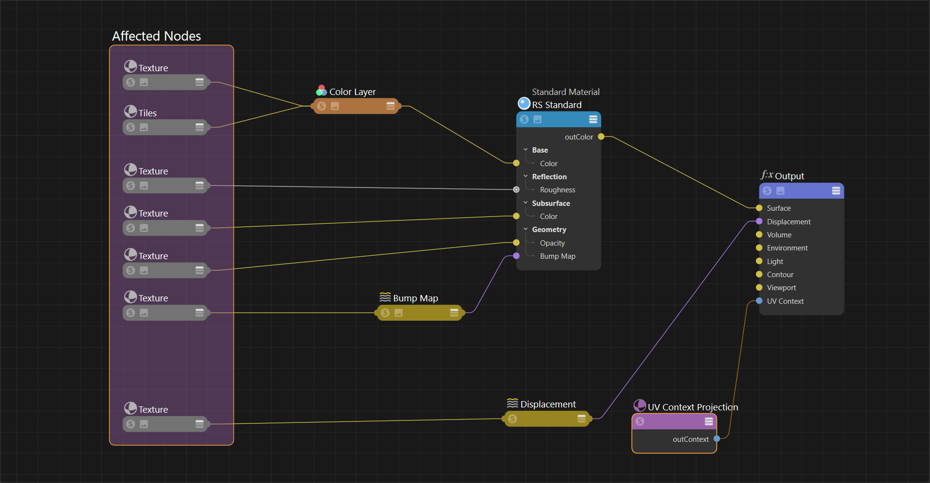 The UV Context Projection is a powerful utility node that applies the same mapping across all the textures connected to a material. Most materials are built using a set of textures that only look good when they perfectly match up with each other. The UV Context Projection node makes it easy to adjust all textures and keep them in sync. This also includes procedural textures that use UVs like the Redshift Tiles shader.