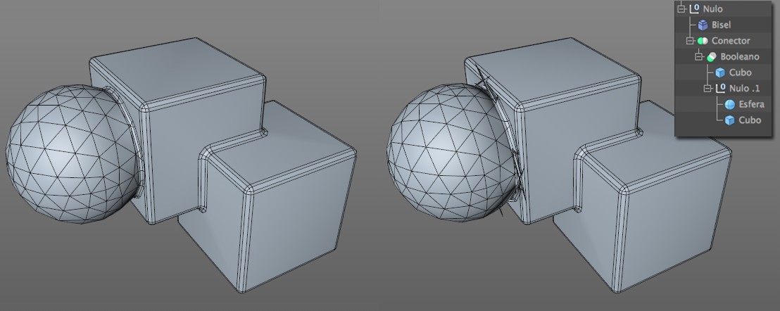 Pueden aparecer biseles defectuosos si la malla no está completamente optimizada. Esto es particularmente cierto para las mallas importadas de aplicaciones CAD (aquí a menudo es útil exportar la malla como N-Gons, si es posible) y objetos Generadores/modelando de Cinema 4D cuyos algoritmos de malla pueden causar problemas (ver imagen). Cuando se combina con Subdivisión de Superficies, el Deformador Bisel puede utilizarse para crear interesantes funcionalidades (véase también Selección).