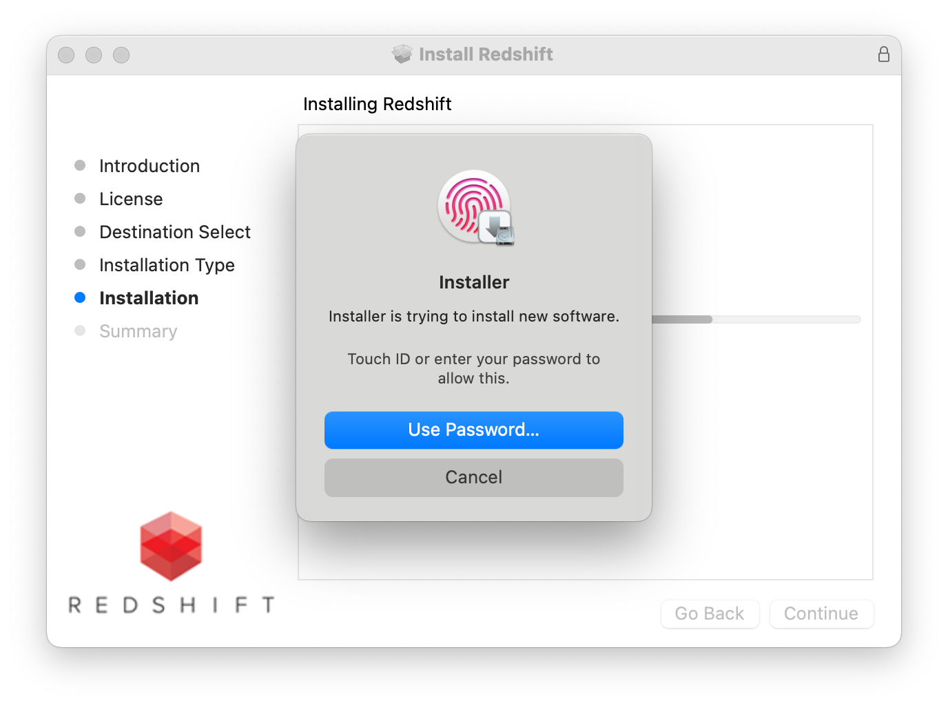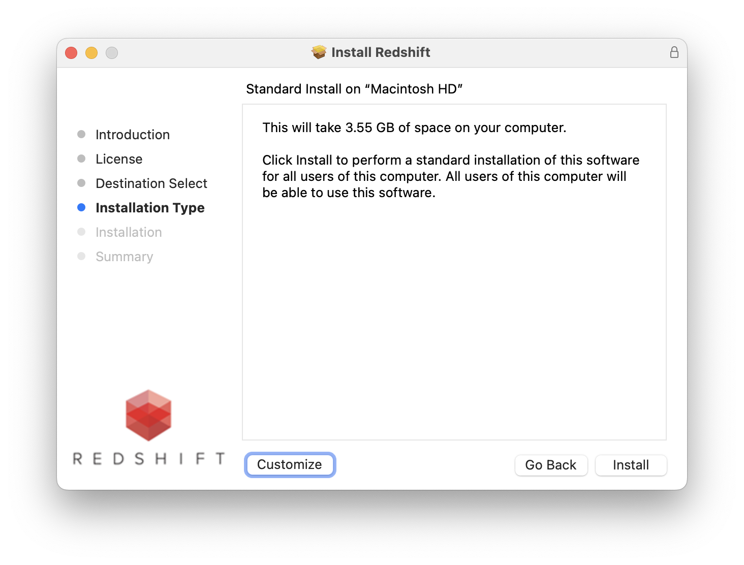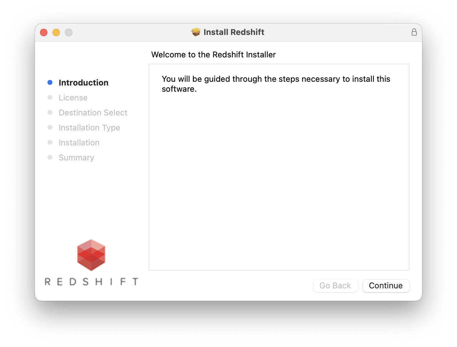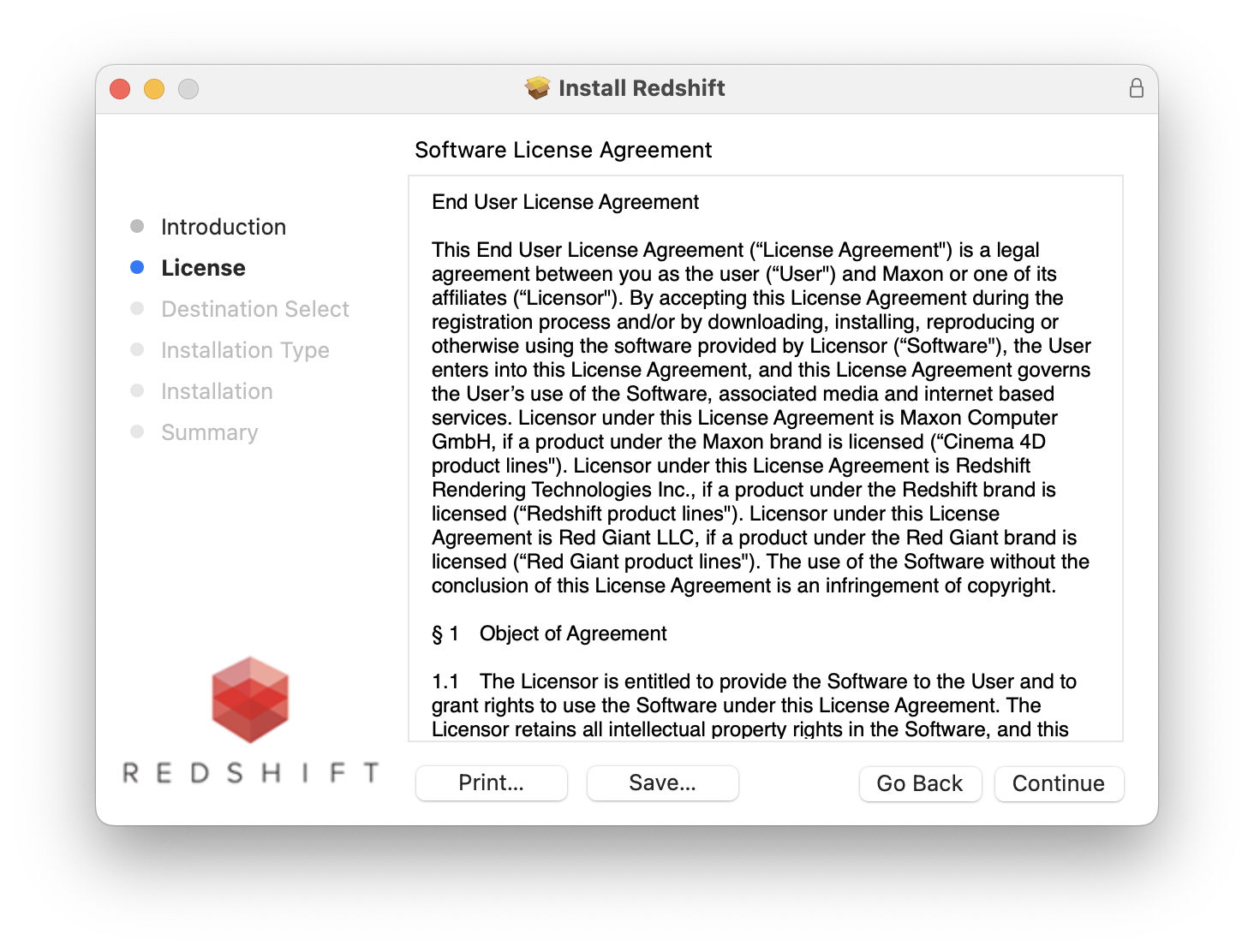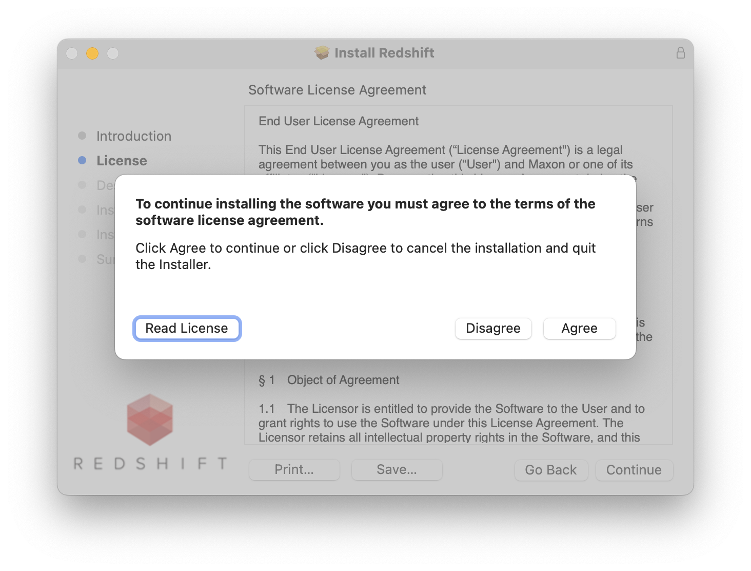 Please carefully review the Redshift Software License Agreement before continuing with the installation.