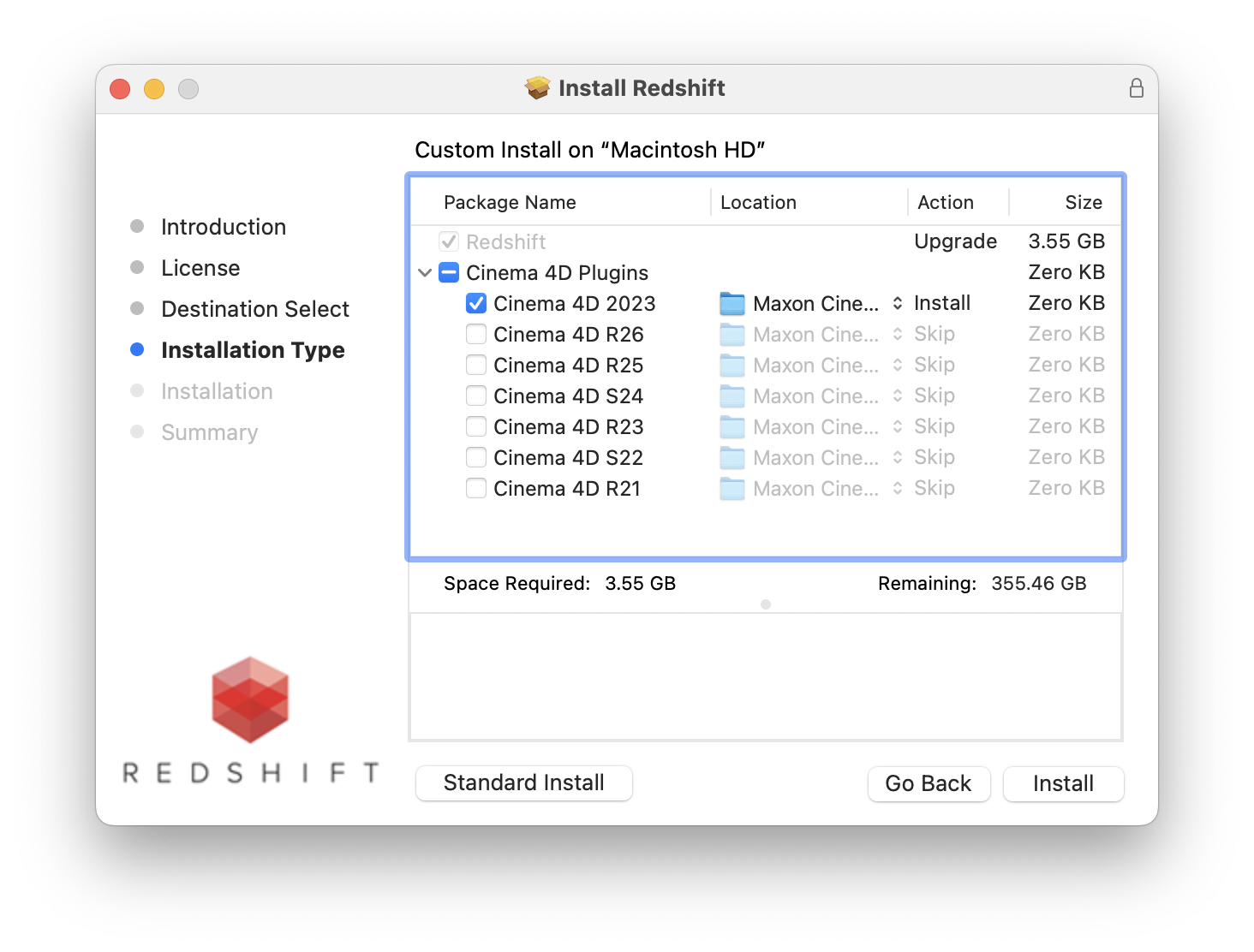After you agree to the licensing terms the installation configuration screen is next, here you control which DCCs are automatically configured for use. By default, the installer will select all compatible versions of a DCC that are detected on your system, however, these can be manually deselected if you do not want a particular version to be set up with the Redshift plugin by clicking on the Customize button in the bottom left. Redshift always installs all the files necessary for each DCC, even if they are not found on your system.