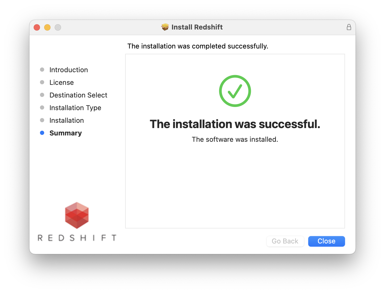 After all the files are written the Redshift installation is now complete, click Close to exit the installer.