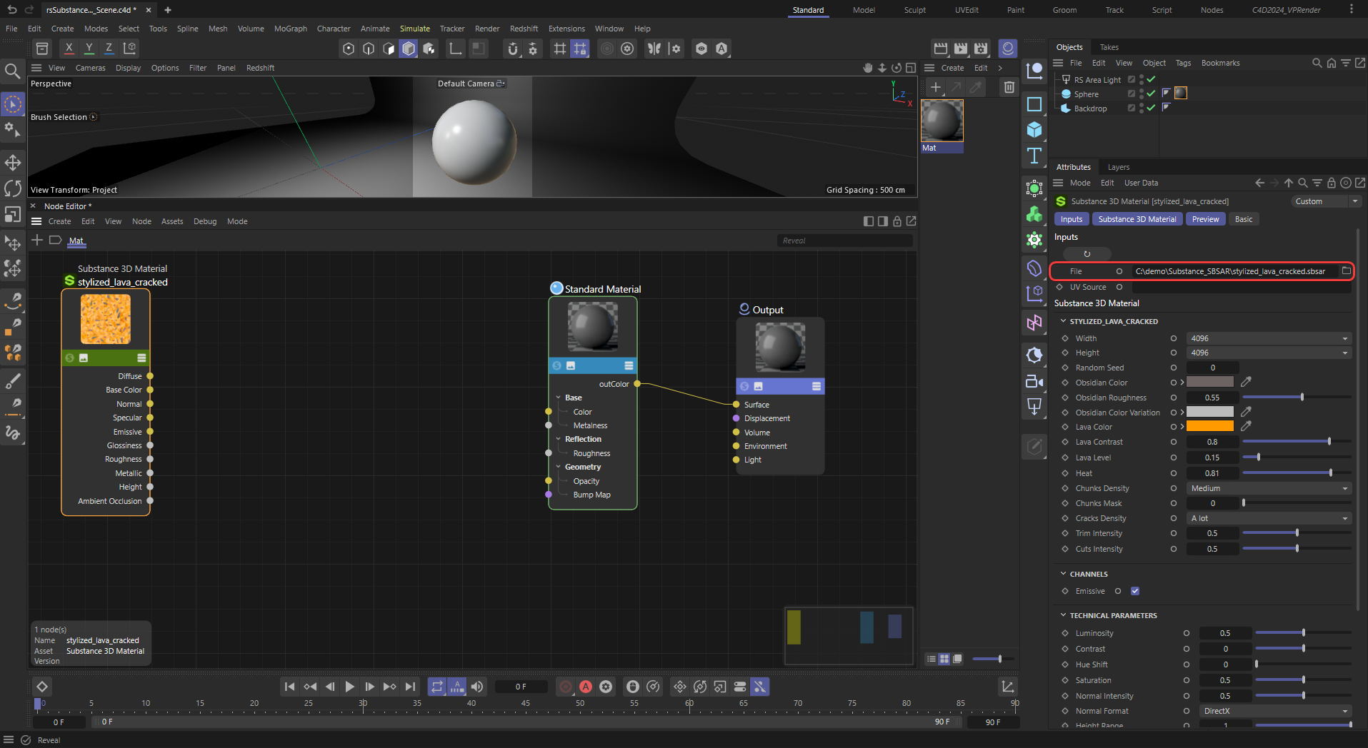 The Substance 3D Material node can be used to quickly load Adobe Substance Designer SBSAR files directly into a Redshift shading graph, allowing you to easily render out high quality Substance textures and tweak their parameters. It is a single node that can be thought of as a bundle of procedurally generated images that can be routed anywhere in a Redshift shader.