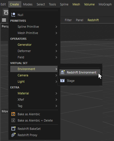 To use the Volumetric Scattering effect simply create a Redshift Environment object from the Create menu like so:
